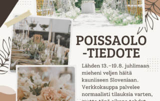 Pieni lomatiedote 🌿✨ Lähden 13.–19.8. juhlimaan mieheni veljen häitä kauniiseen Sloveniaan. 🌿✨ Verkkokauppa palvelee normaalisti tilauksia varten, mutta tänä aikana tehdyt pakettilähetykset lähtevät matkaan 20.8. alkaen. 🌿✨ Kiitos kärsivällisyydestä – palaan täynnä inspiraatiota ja uusia ideoita! 💛🌿✨