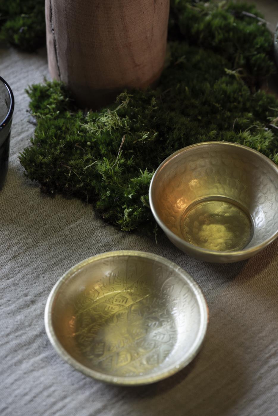 Sievä pieni tarjotin, jossa korkeat reunat ja vasaroitu kuviointi.
